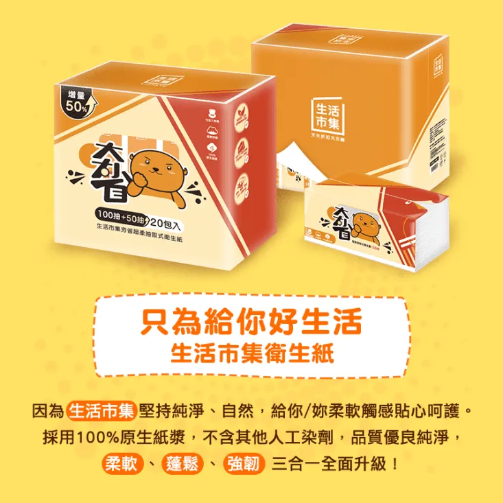 【生活市集】夯省超柔可溶水抽取式衛生紙(150抽/包) 【規格】品牌:生活市集尺寸:180mmx180mm抽數/長度/重量:150抽(±5%)層數:雙層產地:台灣材質/成份:100%原生紙漿總效期:五年包裝內容物:(150抽x20包x4串/箱)、(150抽x20包x1串/箱)是否可碎裂於水中:是