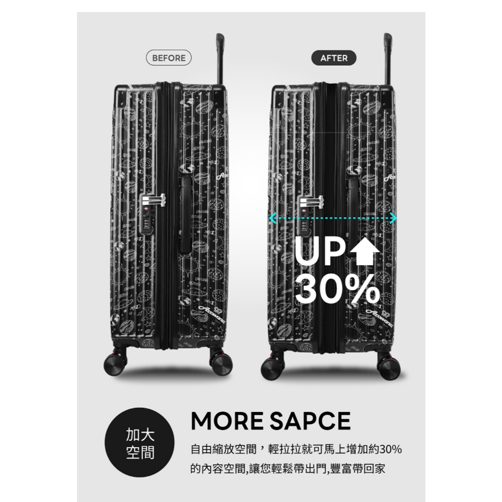 商品配件:新款專利彈簧輪、TSA海關密碼鎖、全新前置行李掛勾、鋁合金強化護角、摩砂紋PC消光材質