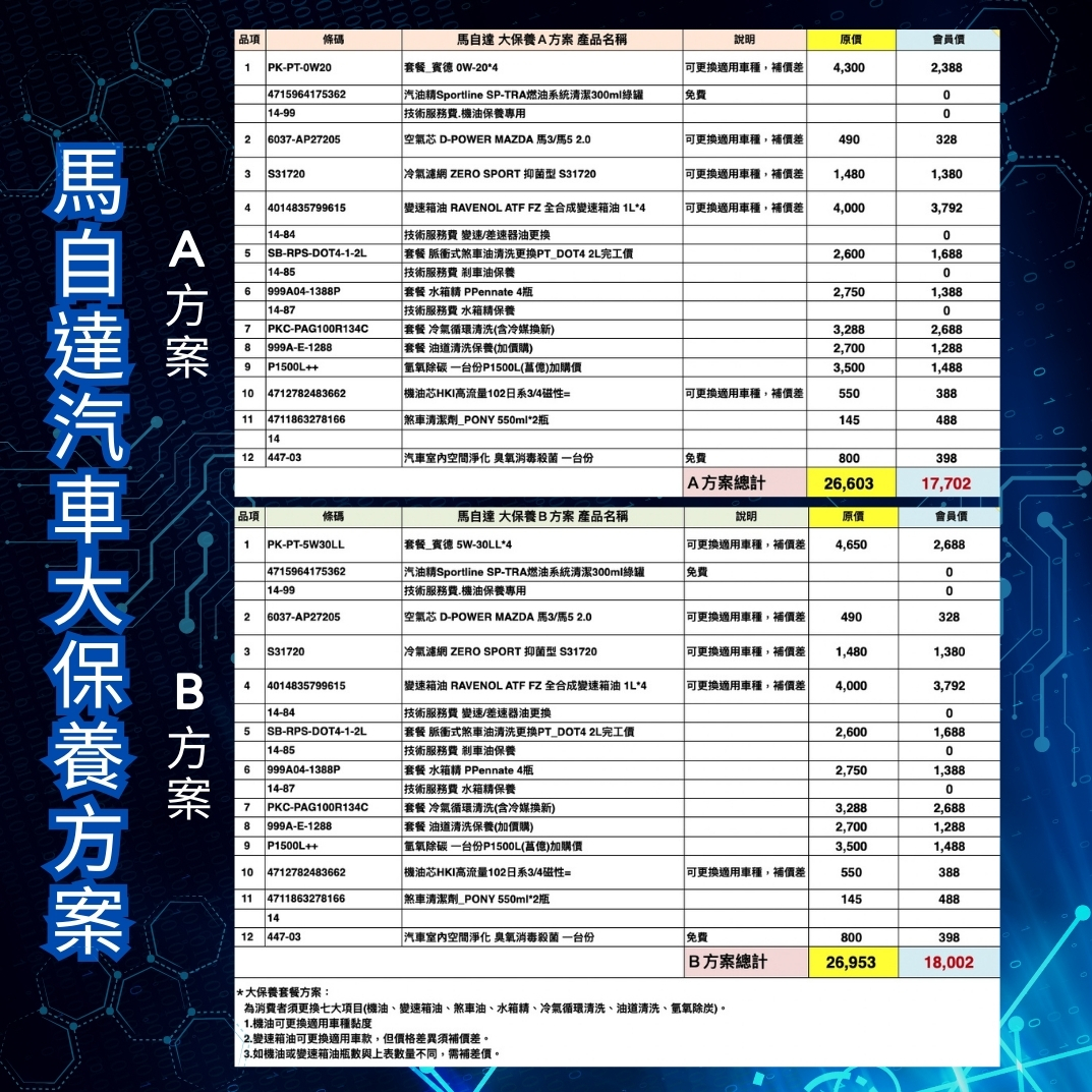 【VIP方案】國產車系-大保養-馬自達汽車A方案。(消費積點:40)