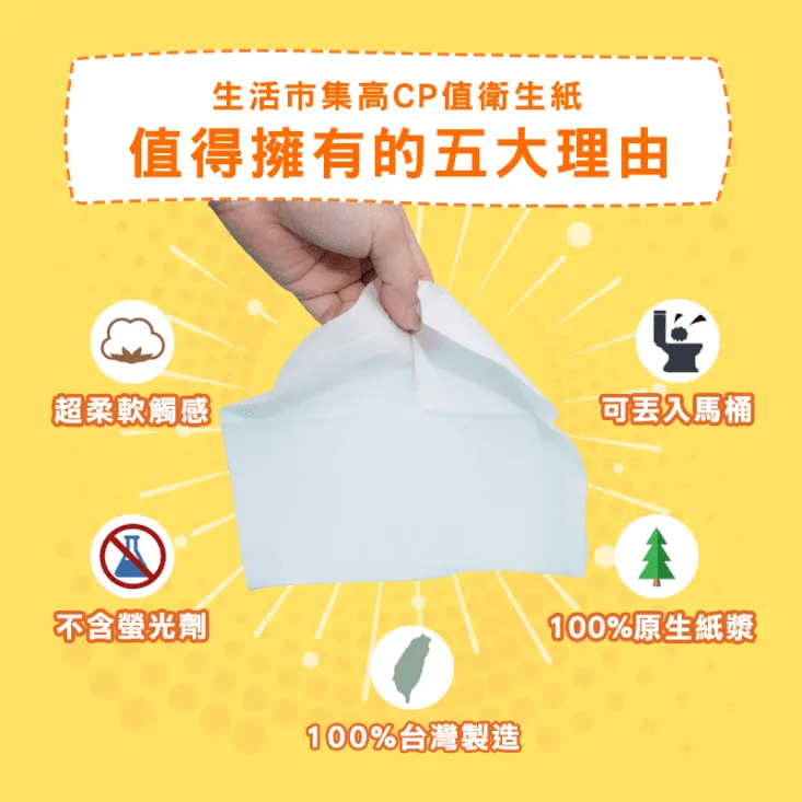 【生活市集】夯省超柔可溶水抽取式衛生紙(150抽/包) 【規格】品牌:生活市集尺寸:180mmx180mm抽數/長度/重量:150抽(±5%)層數:雙層產地:台灣材質/成份:100%原生紙漿總效期:五年包裝內容物:(150抽x20包x4串/箱)、(150抽x20包x1串/箱)是否可碎裂於水中:是