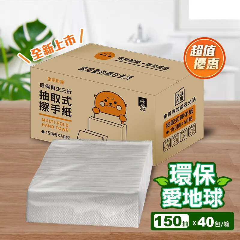 【生活市集】環保再生三折抽取式擦手紙(150抽x40包/箱)