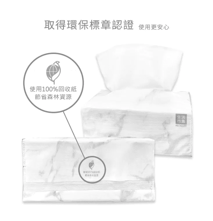 【規格】品牌:生活市集尺寸:195×190mm(CNS許可差±5%)抽數/長度/重量:100抽層數:2層產地:台灣材質/成份:100%回收紙漿總效期:五年包裝內容物:14包x6串/箱可碎裂於水中