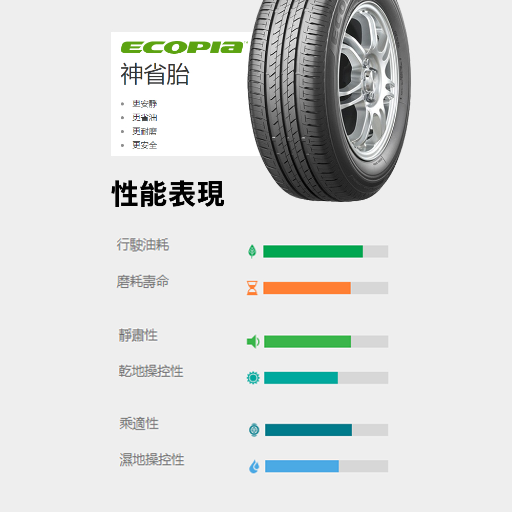 專為追求均衡性能的環保用戶而開發的ECOPIA節能係列輪胎。先進的ECOPIA配方有效降低滾動阻力,提高燃油效率從而節省油耗並減少CO2排放。同時,擁有均衡的濕路和耐用性能。成為眾多節能轎車配套的選擇。