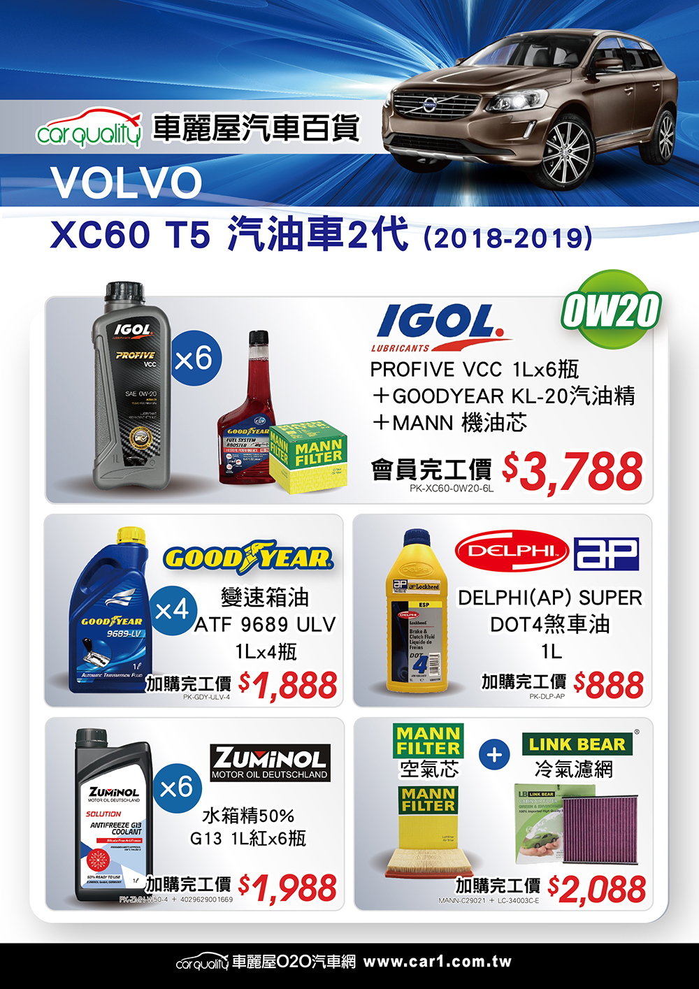 即將上架!VOLVO【伊戈爾 IGOL】機油套餐 0W20 PROFIVE VCC 0W20 6L完工價 (VOLVO XC60 T5 2代汽油車 2.0L 2018-2019)